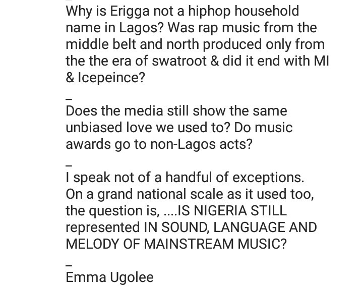 Why is Erigga not a hiphop household name in Lagos? Was rap music from the middle belt and north produced only from the the era of swatroot & did it end with MI & Icepeince?