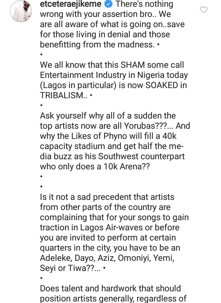 Singer Etcetera replied, telling Emma that his assertion is right. He said that artists like Tuface, Omawunmi, Flavour, Phyno, Waje, MI, Duncan Mighty, and Timaya are all great artists, yet, they “do not get as much buzz and recognition as the artists from the Southwest.”