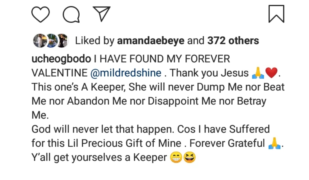 “I HAVE FOUND MY FOREVER VALENTINE @mildredshine . Thank you Jesus. This one’s A Keeper, She will never Dump Me nor Beat Me nor Abandon Me nor Disappoint Me nor Betray Me. God will never let that happen. Cos I have Suffered for this Lil Precious Gift of Mine . Forever Grateful . Y’all get yourselves a Keeper , she captioned the photo of her beautiful daughter, Mildred.”