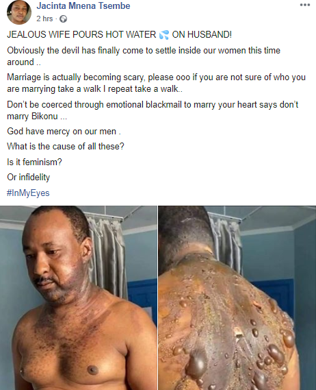 Unconfirmed reports claim the woman allegedly discovered that her husband had a side chic so she poured hot water on him in anger.