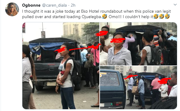 “I thought it was a joke today at Eko Hotel roundabout when this police van legit pulled over and started loading Ojuelegba. Omo!!! I couldn’t help it”