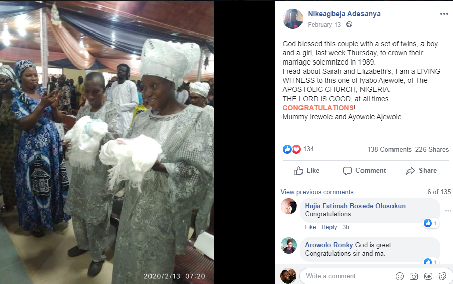 “God blessed this couple with a set of twins, a boy and a girl, last week Thursday, to crown their marriage solemnized in 1989.