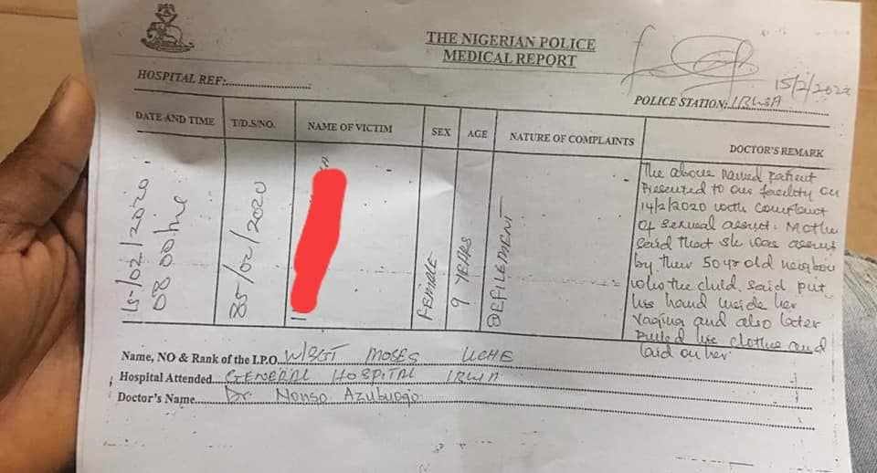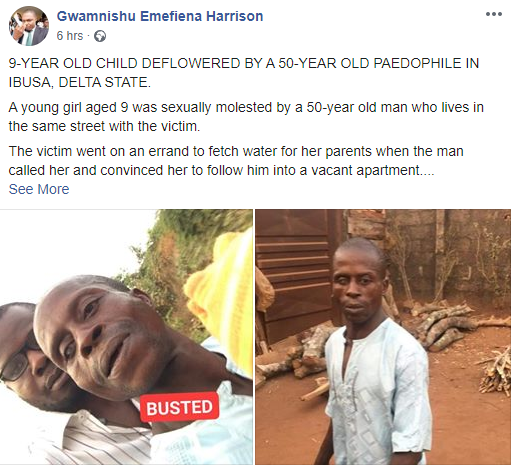 A yet-to-be identified man has been arrested in Ibusa, Delta state for allegedly defiling a 9-year-old girl.