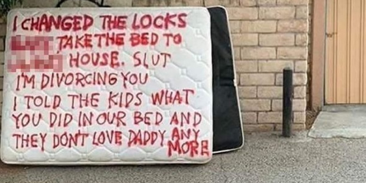 According to the woman, she got revenge on her cheating husband by spray painting a message on their mattress and leaving it outside the house for her cheating husband, and the neighbours, to find.