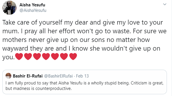 The fight took another dimension after Bashir, son of Nasir El-Rufai left a comment on Twitter describing Aisha as a mad woman.