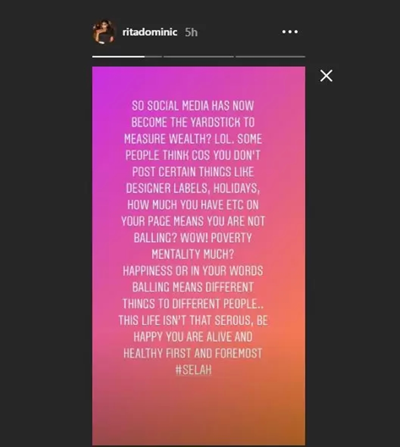 Actress Rita Dominic has shaded those who think she’s not ‘balling’ because she doesn’t post hef designer labels and holiday trips on her social media pages like fellow celebrities.