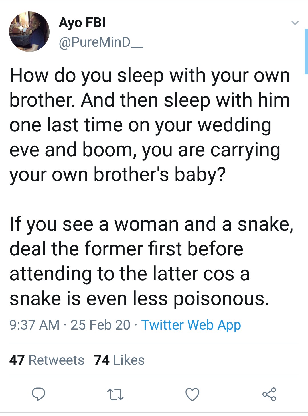 Twitter user, identified as Ayo FBI has taken to the platform to narrate how an unidentified lady got pregnant for her biological brother while planning her wedding.