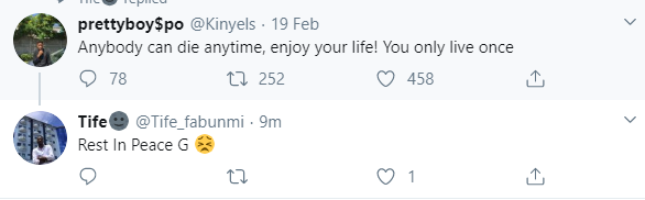 A young Twitter user identified as Dolapo has died after tweeting about death and enjoying life before one’s demise.