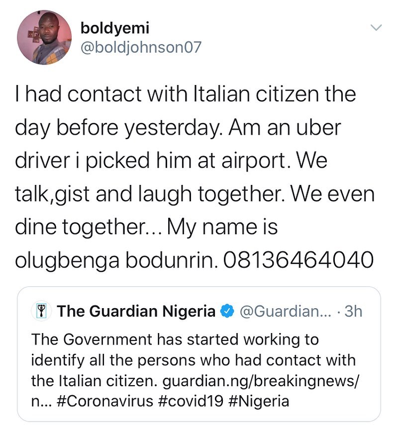 Hours after coronavirus (Covid-19) case was confirmed in Lagos State, Nigeria by the Federal Ministry of Health, a Nigerian man on social media identified as Olugbega Bodunrin (@boldjohnson07), has come out to make claims that he was the cab driver that conveyed the Italian citizen who was infected with the virus.