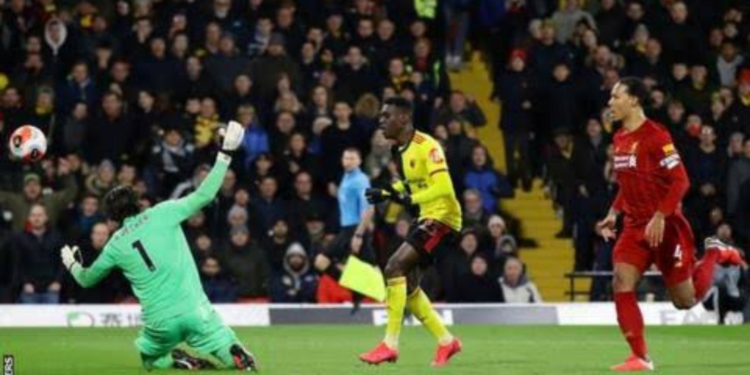 Watford’s heads did not drop without one of their most dangerous players, though, as only Alisson Becker’s fleetness of foot allowed the Brazilian international to save from Deeney deep into first-half stoppage time.