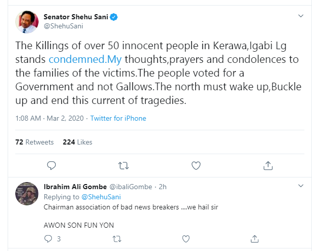 The Killings of over 50 innocent people in Kerawa,Igabi Lg stands condemned. My thoughts, prayers and condolences to the families of the victims.The people voted for a Government and not Gallows.The north must wake up, buckle up and end this current of tragedies.