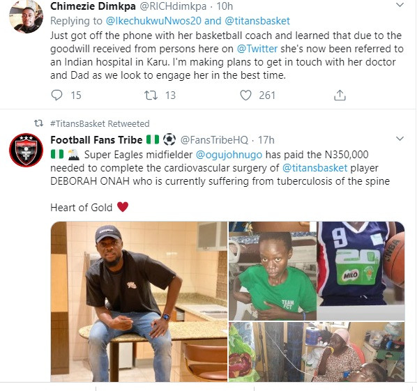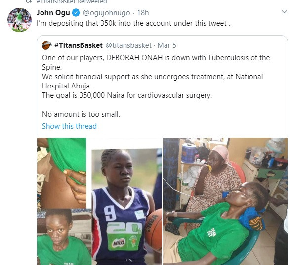 The player made the pledge after Deborah’s Abuja based basketball academy, Titans Basket, took to their Twitter handle on Friday to announce that Deborah needed the sum of N350,000 to help with treatment of the disease at the National Hospital, Abuja.