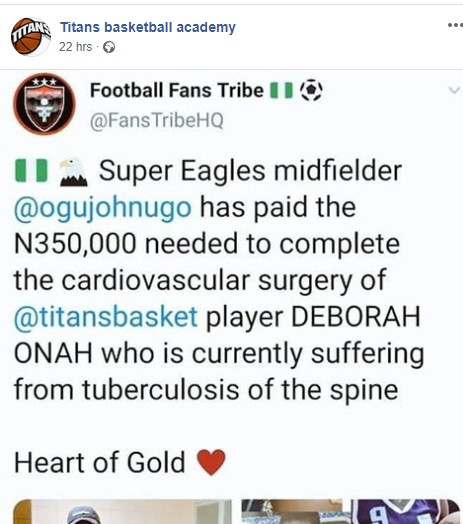 Super Eagles of Nigeria player John Ogu has paid a sum of $1000 as treatment fee for a Nigerian female basket ball player Deborah Onah who is down with Tuberculosis of the Spine.