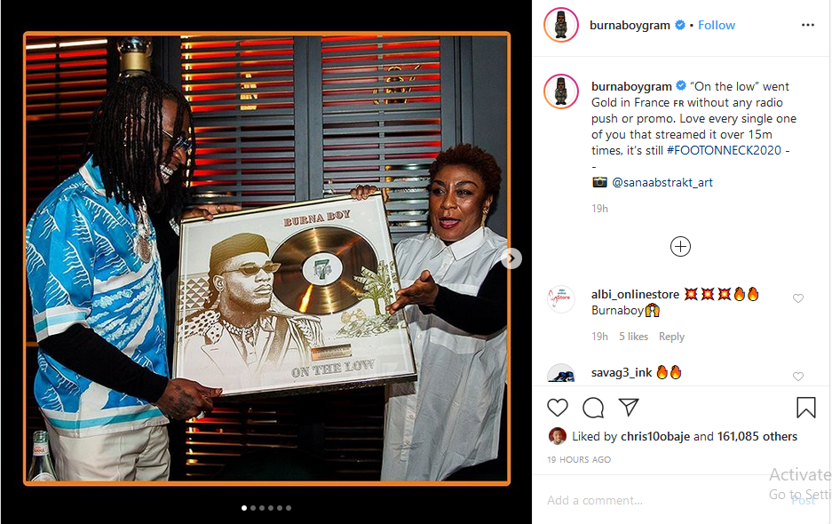 Yesterday, Burna Boy was presented with a gold plaque for his 2018 track “On the Low” which appeared on his Grammy-nominated album African Giant.