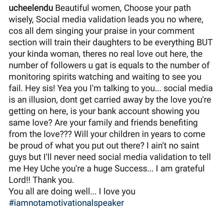 Hey sis! Yea you I’m talking to you… social media is an illusion, dont get carried away by the love you’re getting on here, is your bank account showing you same love? Are your family and friends benefiting from the love??? Will your children in years to come be proud of what you put out there? I ain’t no saint guys but I’ll never need social media validation to tell me Hey Uche you’re a huge Success… I am grateful Lord!! Thank you.