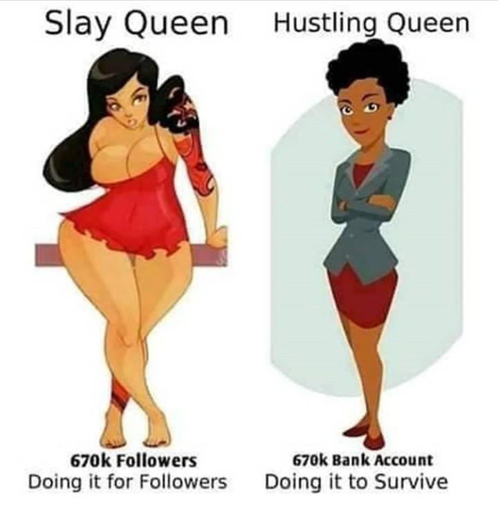 The slay queen’s efforts earned her 670k followers while the hustling queen has 670k in her bank account.