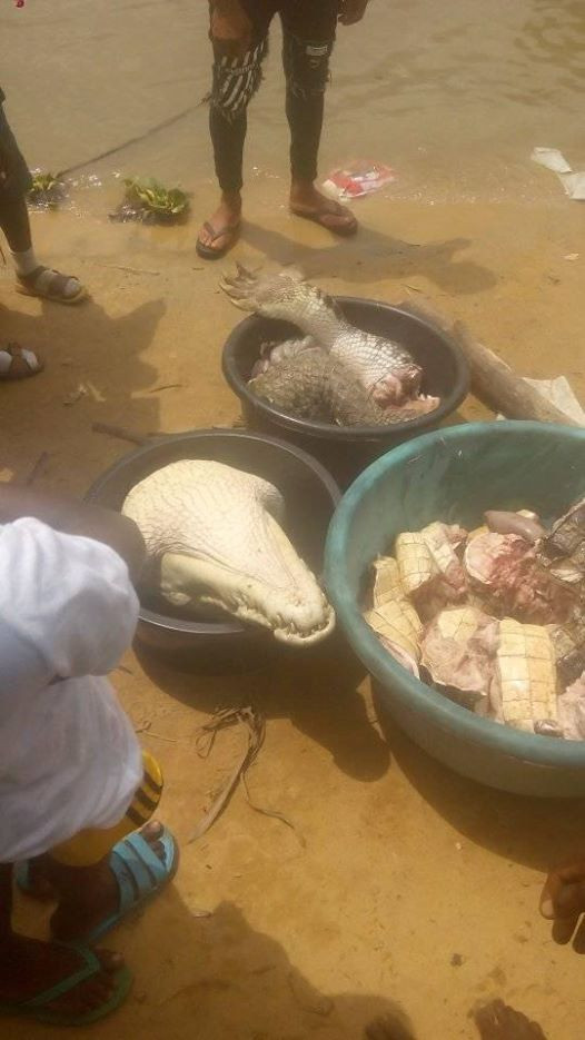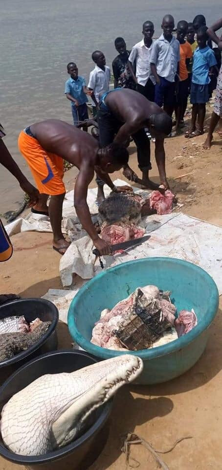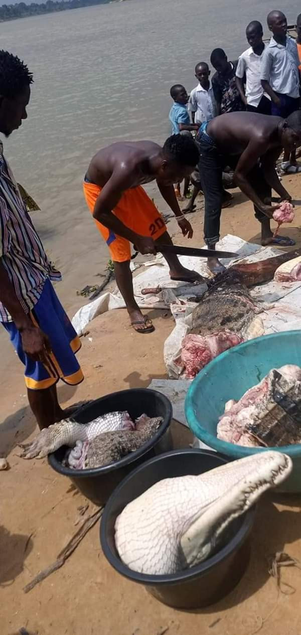 Exclusive photos of residents sharing the meat after killing the crocodile have surfaced on internet.