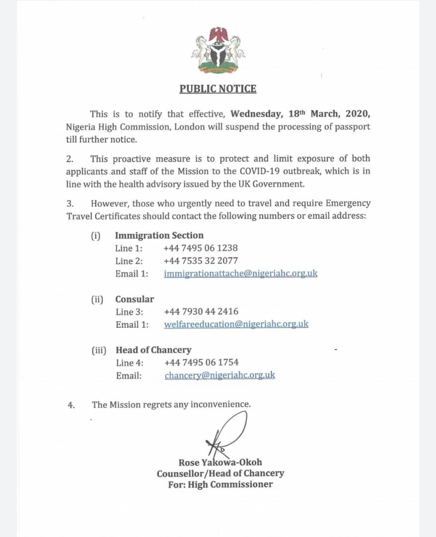 Coronavirus: Nigerian high commission in London suspends passport processing