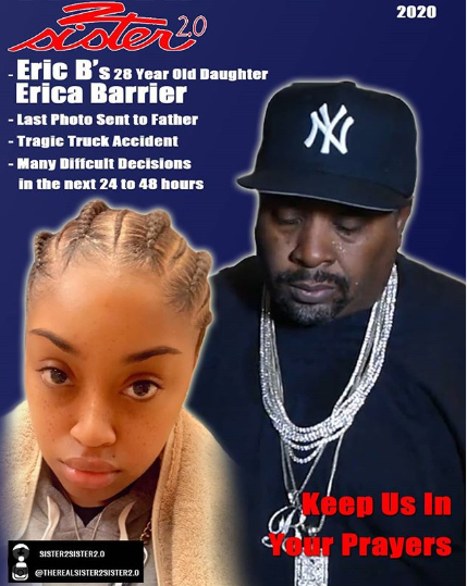 Foster Brown wrote on IG: “Twenty Eight year old, Erica Supreme Barrier, the daughter of music legend Eric Barrier ( Eric B) is in extreme critical condition this morning after a horrific car crash in Connecticut. This after an 18 wheeler rolled over her vehicle at approximately 1am in Hartford. Investigators are still piecing together the exact cause of the crash. Barrier is suffering from severe neck and spine fractures, among her many life threatening injuries, confirmed Eric B’s long time publicist Alvina Alston. The family is at her bedside and asking for your prayers”