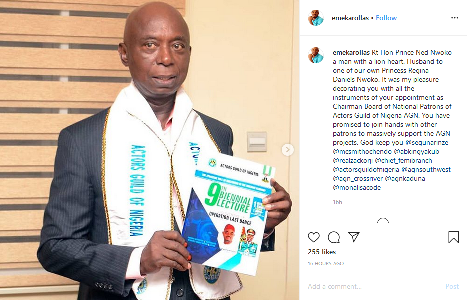 “Rt Hon Prince Ned Nwoko a man with a lion heart. Husband to one of our own Princess Regina Daniels Nwoko. It was my pleasure decorating you with all the instruments of your appointment as Chairman Board of National Patrons of Actors Guild of Nigeria AGN. You have promised to join hands with other patrons to massively support the AGN projects. God keep you.”