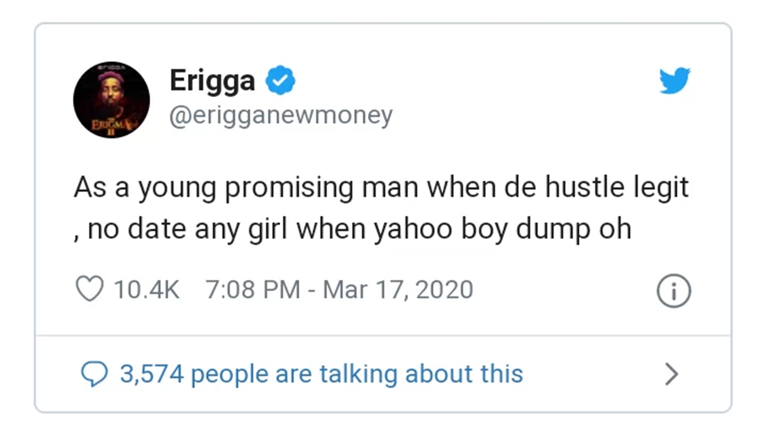 He wrote: “As a young promising man when dey hustle legit , no date any girl when yahoo boy dump oh”