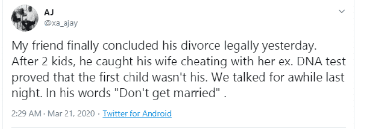 “My friend finally concluded his divorce legally yesterday. After 2 kids, he caught his wife cheating with her ex. DNA test proved that the first child wasn’t his. We talked for awhile last night. In his words “Don’t get married”.