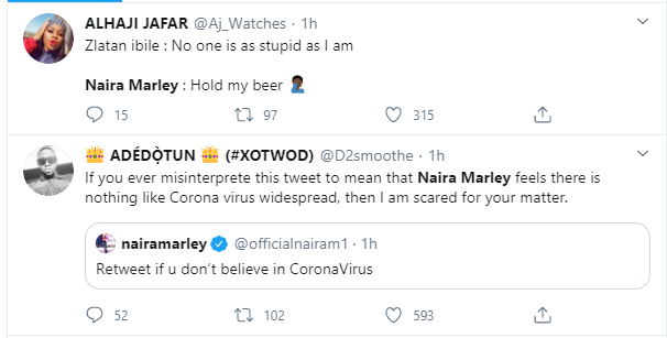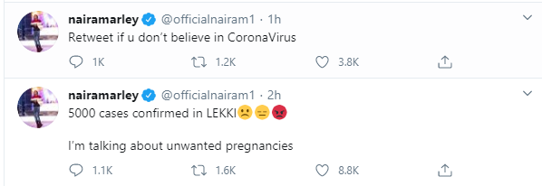 Marley took to Twitter and wrote, “Retweet if you don’t believe in coronavirus.” He also went ahead to joke about ‘5,000 cases of confirmed unwanted pregnancies’ in Lekki area of Lagos State.