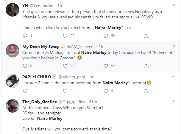 Marley took to Twitter and wrote, “Retweet if you don’t believe in coronavirus.” He also went ahead to joke about ‘5,000 cases of confirmed unwanted pregnancies’ in Lekki area of Lagos State.
