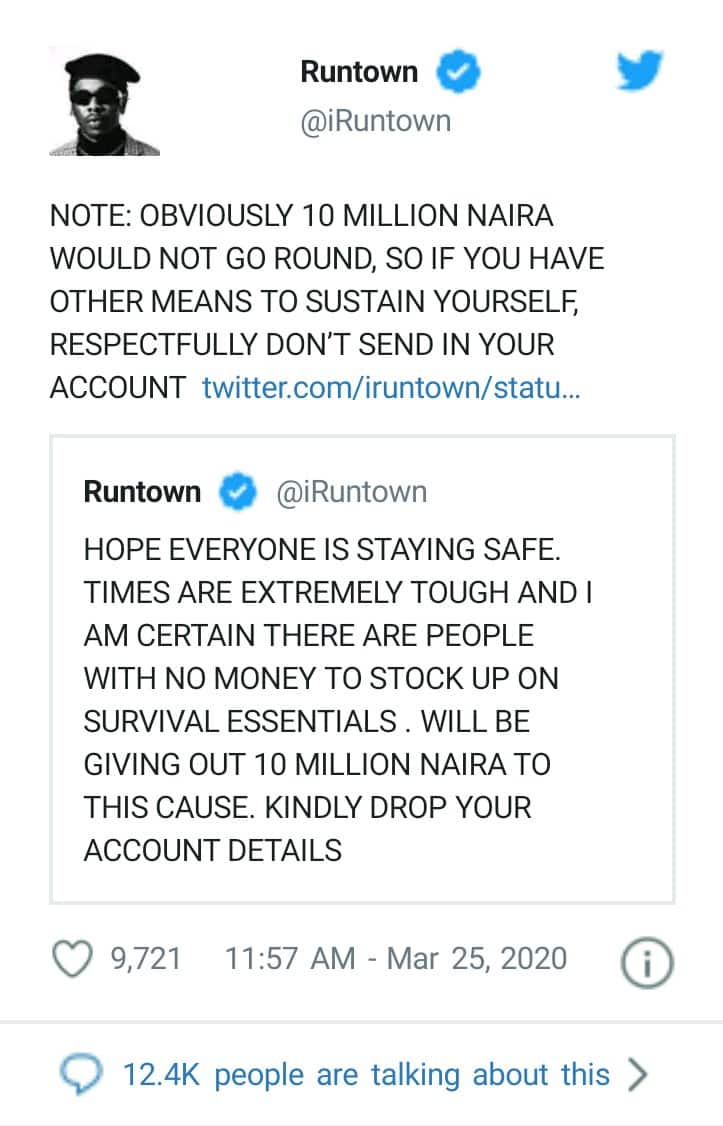 Runtown took to his twitter page to ask fans who are financially incapacitated to drop their account details for the giveaway. He further warned those who have money not to drop their details.