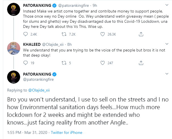 In a tweet he shared, Patoranking stated that Nigerian artistes should be contributing money to help those offline as they are the most disadvantaged people at this time.
