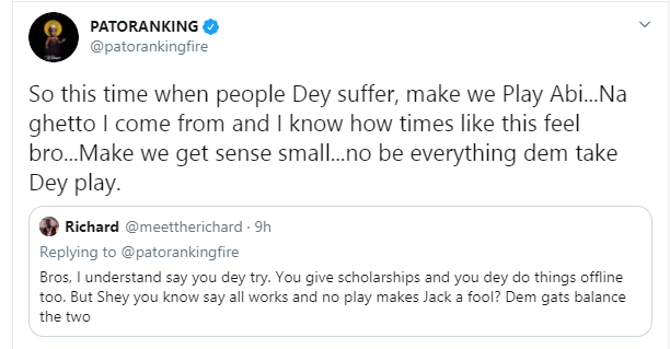 Patoranking also slammed a Twitter user who stated that entertainers must do giveaways online because “all work and no play makes Jack a fool”.