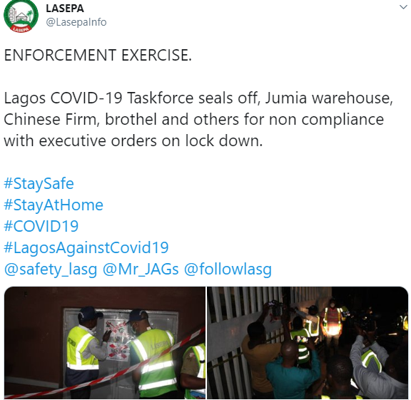 Hours after President Muhammadu Buhari ordered a lockdown in Lagos State, a warehouse belonging to Jumia, an online marketing store has been sealed off by the Lagos State Environmental Protection Agency (LASEPA) and Lagos State Safety Commission for defying the stay at home order issued by President Buhari.