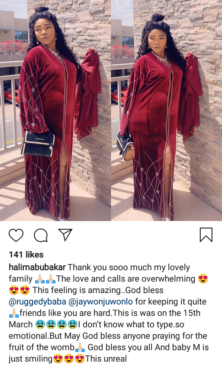 “Thank you sooo much my lovely family 🙏🏻🙏🏻The love and calls are overwhelming 😍😍😍 This feeling is amazing..God bless @ruggedybaba @jaywonjuwonlo for keeping it quite🙏🏻friends like you are hard.This is was on the 15th March 😫😫😫😫I don’t know what to type.so emotional.But May God bless anyone praying for the fruit of the womb🙏🏻 God bless you all And baby M is just smiling😍😍😍This unrealNollywood actress, Halima Abubakar made a post today thanking two of her Male celeb friends for ”keeping it quiet”…..