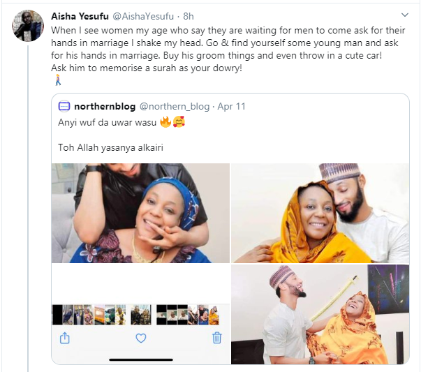 Following the loved up photos of an older woman who recently got married to a much younger man which went viral, Bring Back Our Girls, BBOG Activist Aisha Yesufu has expressed her opinion about older women and marriage.