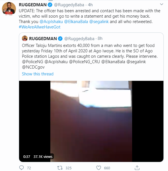 “The Police Officer from Ago Division in the trending video has been identified and arrested. He will be subjected to internal disciplinary proceedings known as Orderly room trial. #SayNOtoImpunity #BeSafe.