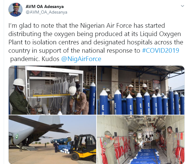 I’m glad to note that the Nigerian Air Force has started distributing the oxygen being produced at its Liquid Oxygen Plant to isolation centres and designated hospitals across the country in support of the national response to #COVID2019 pandemic. Kudos @NigAirForce.