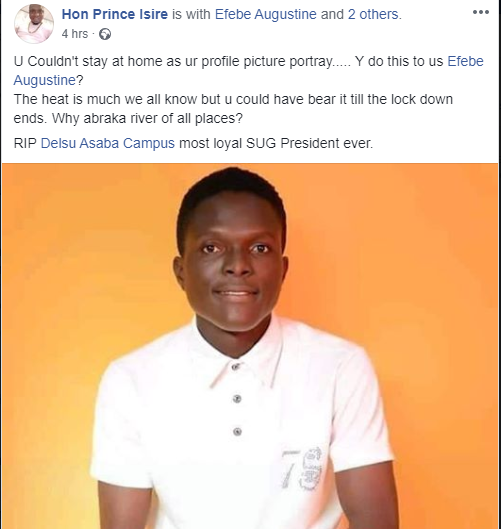 Tragedy as a former SUG President of Delta State University (DELSU) identified as Efebe Augustine reportedly lost his life after drowning in a river in Abraka, Delta State.
