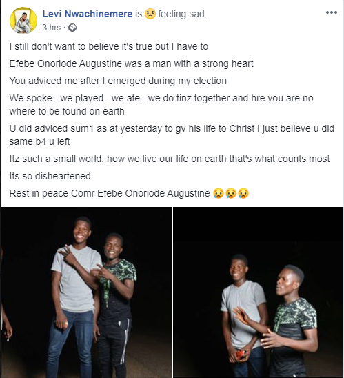 I still don’t want to believe it’s true but I have to Efebe Onoriode Augustine was a man with a strong heart. You adviced me after I emerged during my election We spoke…we played…we ate…we do tinz together and hre you are no where to be found on earth. U did adviced sum1 as at yesterday to gv his life to Christ I just believe u did same b4 u left. Itz such a small world; how we live our life on earth that’s what counts most. Its so disheartened.