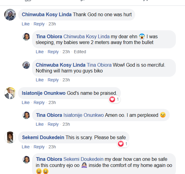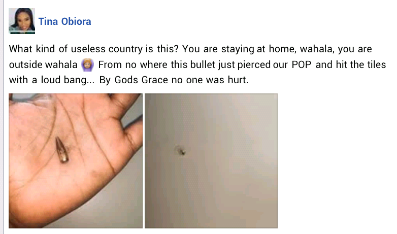 “What kind of useless country is this? You are staying at home, wahala, you are outside wahala. From no where this bullet just pierced our POP and hit the tiles with a loud bang… By Gods Grace no one was hurt.”