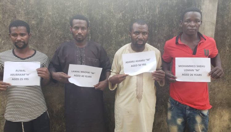 According to the statement, suspects arrested are Lawal Mazaje, 40 years from Felele area of Kogi State; Adamu Adamu, 50 years from Jada area of Adamawa State; Mohammed Shehu Usman, 26 years from Illela area of Sokoto State and Auwal Abubakar, 25 years from Shinkafi area of