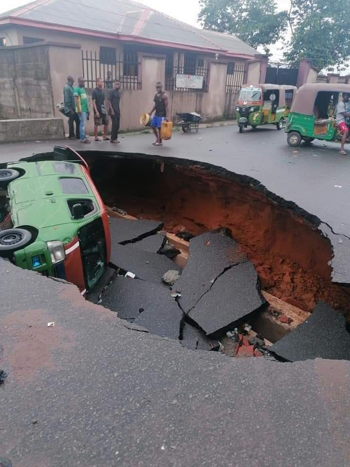 Panic as a sinkhole caused by heavy rainfall appeared in the middle of the road in Ogbor Hill, just after Waterside, Aba.