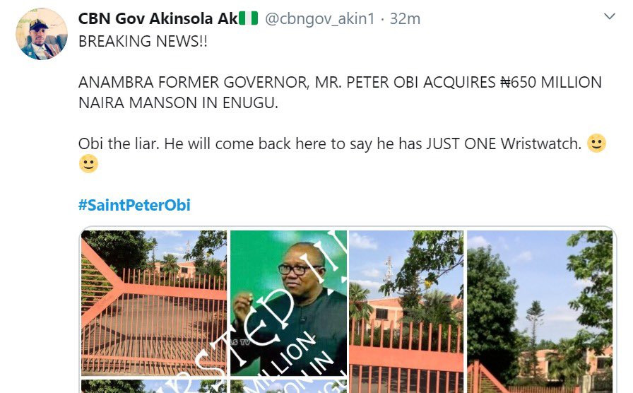 Reacting to the report via Twitter, Peter Obi said he doesn’t need a house outside Anambra.