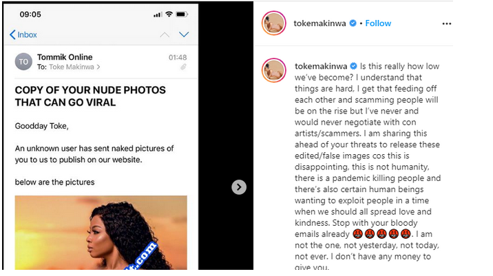 Controversial media personality and entrepreneur, Toke Makinwa, has taken to social media to expose some persons who allegedly tried to blackmail her with her ‘nudes’.