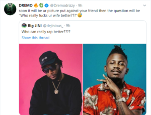 The ‘Joke’ didn’t go down well with Dremo, that he had to hit back hard.”soon it will be ur picture put against your friend then the question will be “Who really fucks ur wife better???” Dremo replied