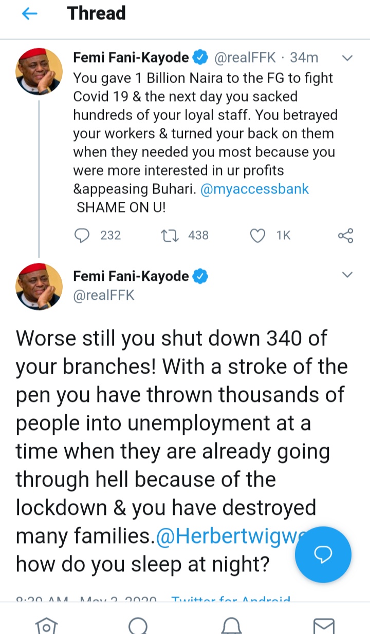 Former Minister of Aviation and chieftain of the Peoples Democratic Party (PDP), Femi Fani-Kayode, has condemned Access Bank and its Group Managing Director, Herbert Wigwe, over the sacking of some workers.