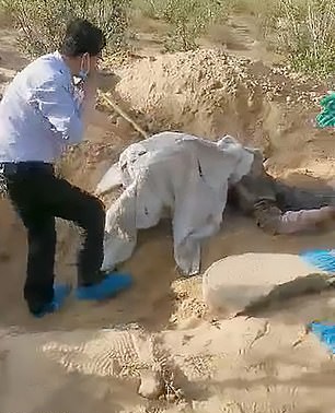Disturbing footage shows Ms Wang covered in mud while being pulled out from the burial pit by two police officers.