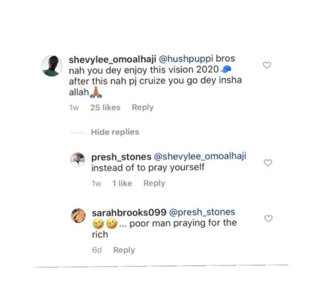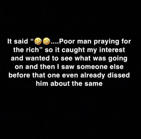 The troll had replied to the prayer a follower left for him; “poor man praying for the rich”