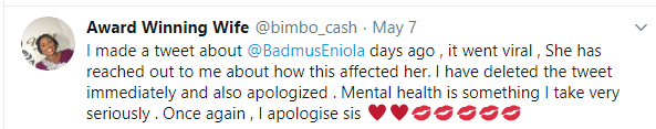 “I made a tweet about BadmusEniola days ago , it went viral , She has reached out to me about how this affected her. I have deleted the tweet immediately and also apologized . Mental health is something I take very seriously . Once again , I apologise sis” She wrote…