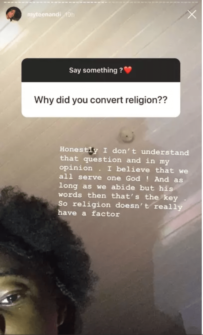 Daughter of Nollywood actor, Bolanle Ninalowo has revealed on Instagram why she converted her religion. The girl who goes by the name Aliyah was asked by one of her followers on Instagram why she changed her religion from Islam to Christianity.