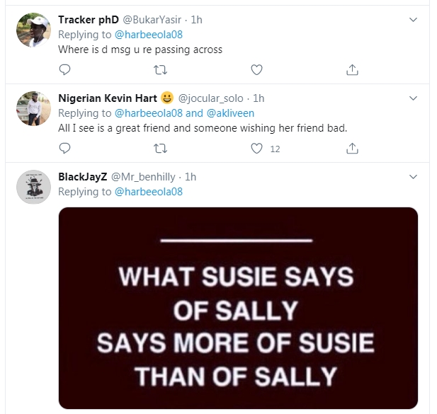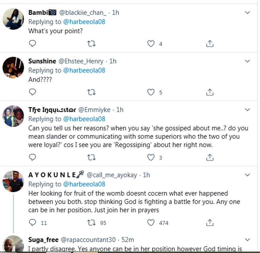 After she made the post, some Twitter user took to her handle to call her out for jubilating over her friend’s childlessness, saying that she is too bitter to be called a mother herself, while some cautioned her against thinking that it is God that revenged on her behalf…